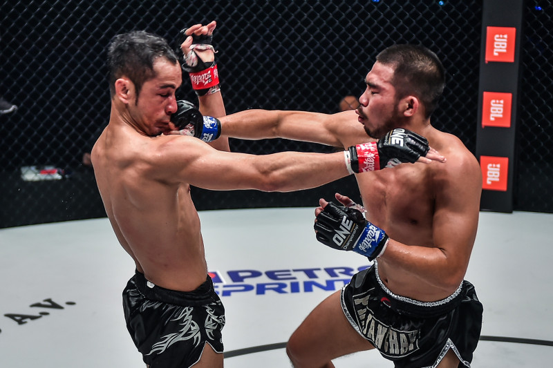 サムエー(左)に強烈な右をヒットさせるプラジャンチャイ(右)©️ONE