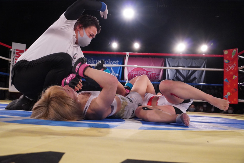 村上(左)が腕十字を極めて一本勝ちする瞬間