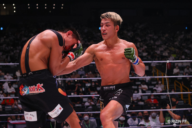 堀江のボディで佐々木の身体はくの字に曲がる