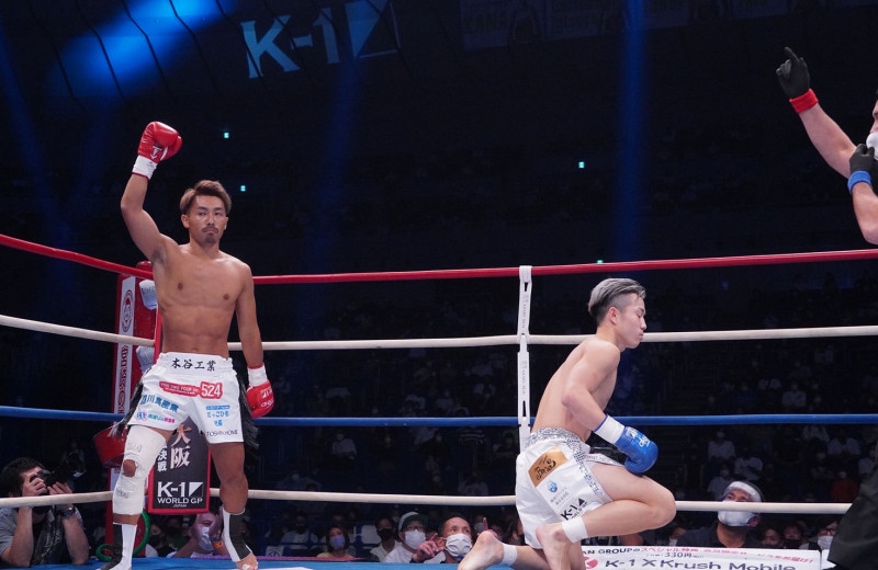 1R、カウンターの右フックで西元(右)からダウンを奪った村越