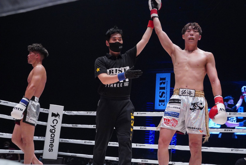 勝ち名乗りを受ける実方(右)