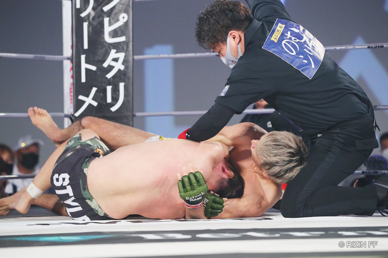 渡部が内藤を絞め上げ一本勝ちした瞬間