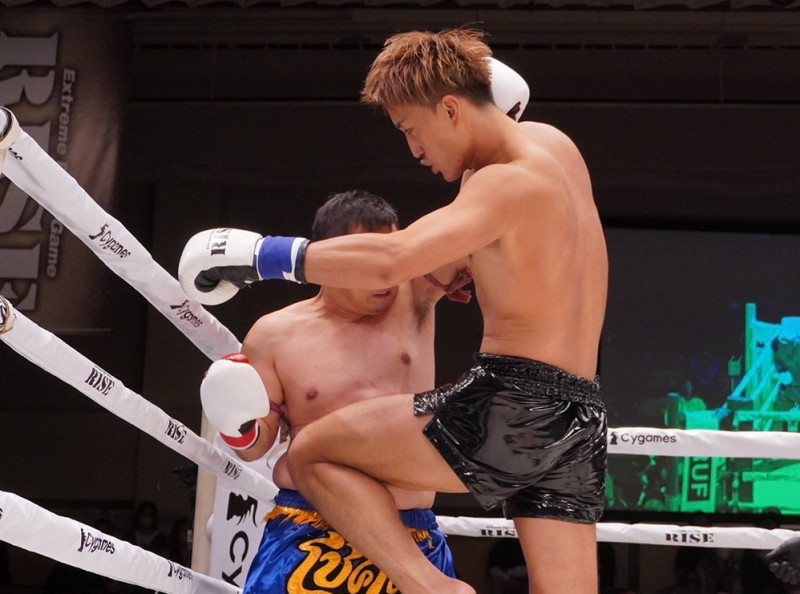 南原のヒザ蹴りがクワンのボディをえぐる瞬間!