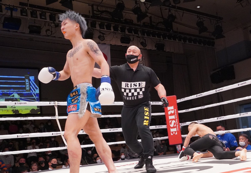 平野がハイキックと、最後はカーフキックでダウンを奪いSBからの刺客・手塚にKO勝利した