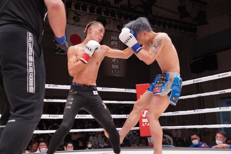 カーフキックがヒットする瞬間!パンチのカウンターで蹴っている
