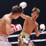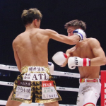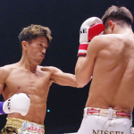 バッティングにより流血、タオルを巻いた植山(右)と、勝ち名乗りを受ける京谷(左)