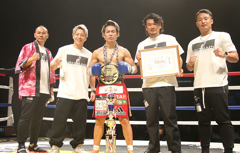 武尊(左から2番目)ら所属ジムのメンバーたちと並ぶ大岩(中央)