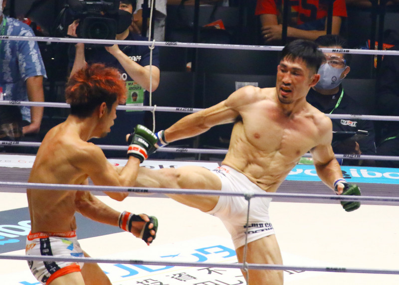 前田(右)が砂辺をキックで攻める