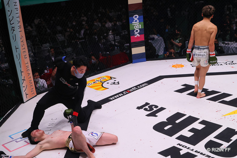 平松(左)が立ち上がれず政所がKO勝ち