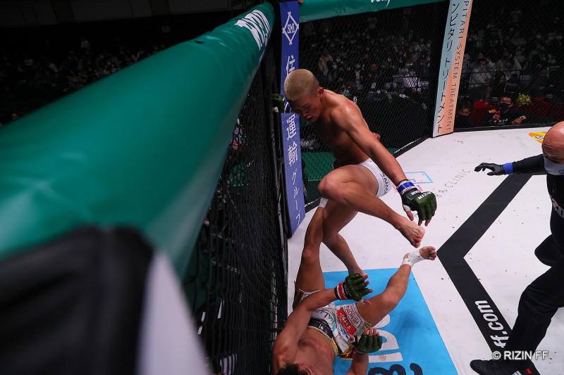 金網を掴みながら踏みつけようとする木下