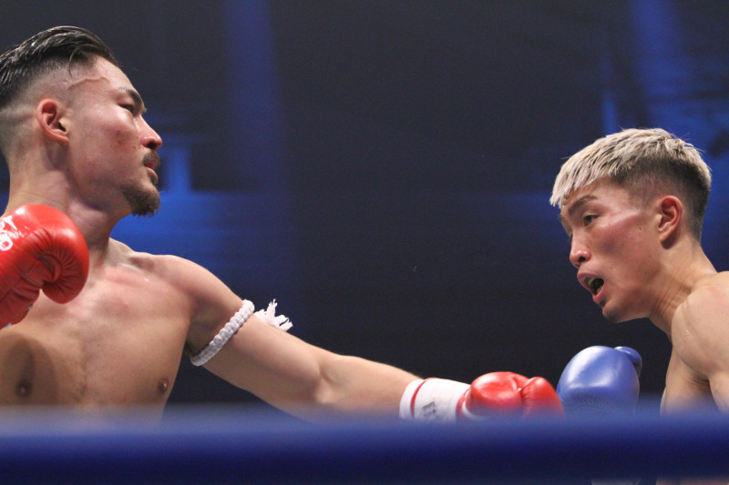 強烈なパンチを振るう神保(左)