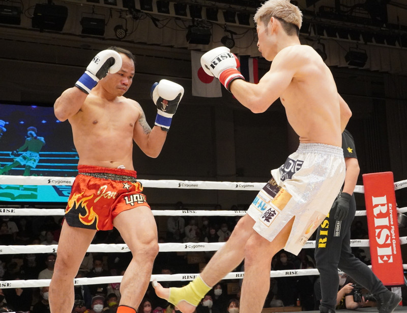 右のカーフキックを蹴る直樹