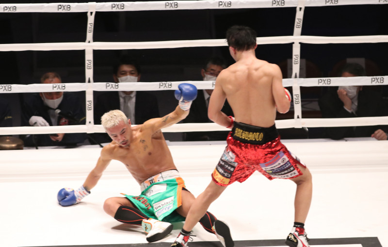 松本がKO勝ちする瞬間、相手はゆっくりキャンバスに沈む