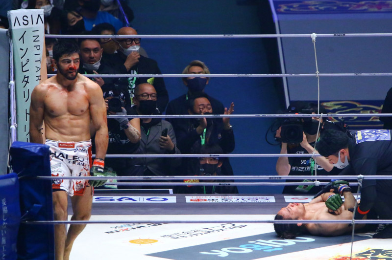 サトシ(左)が鼻血も、最後は腕ひしぎ三角固めで一本勝ち、防衛に成功