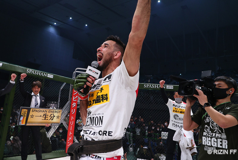 クレベルが 元UFC佐々木憂流迦に勝利しファンとともに「1、2、3、ポペガー!」と叫ぶ。ポペガーはポルトガル語で極めるの意味だ。