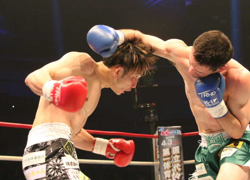 トファネリ(右)のパンチを佐々木がギリギリかわす。