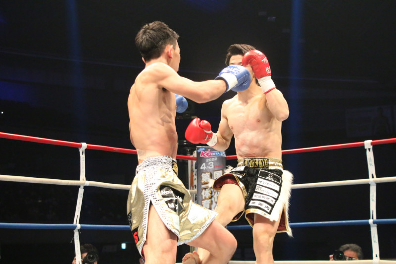 金子の強烈なカーフキックで璃明武の身体が崩れる!