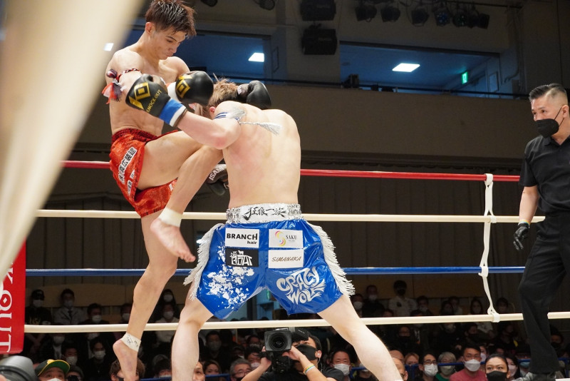 この飛びヒザ蹴りでダウンを奪う栗秋