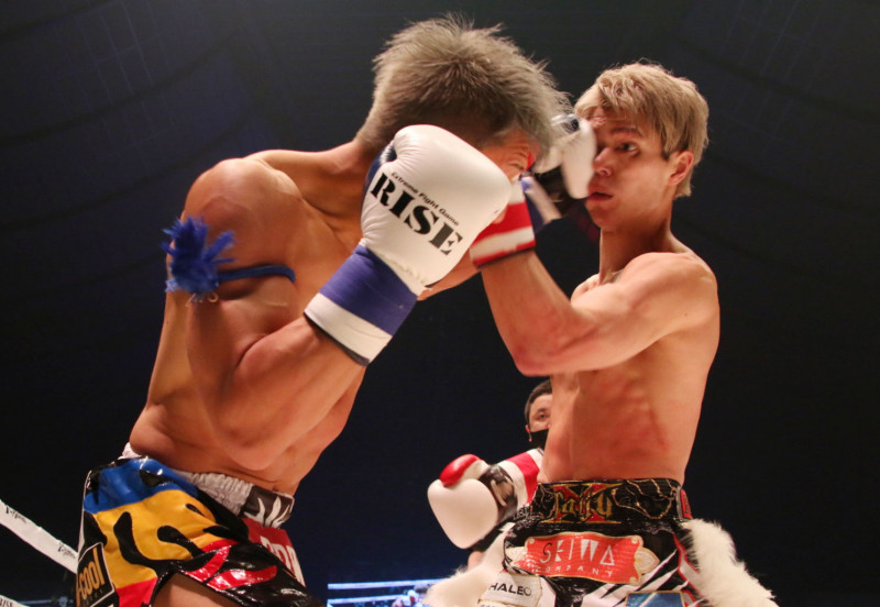 パンチを打ち合う白鳥(右)と秀樹