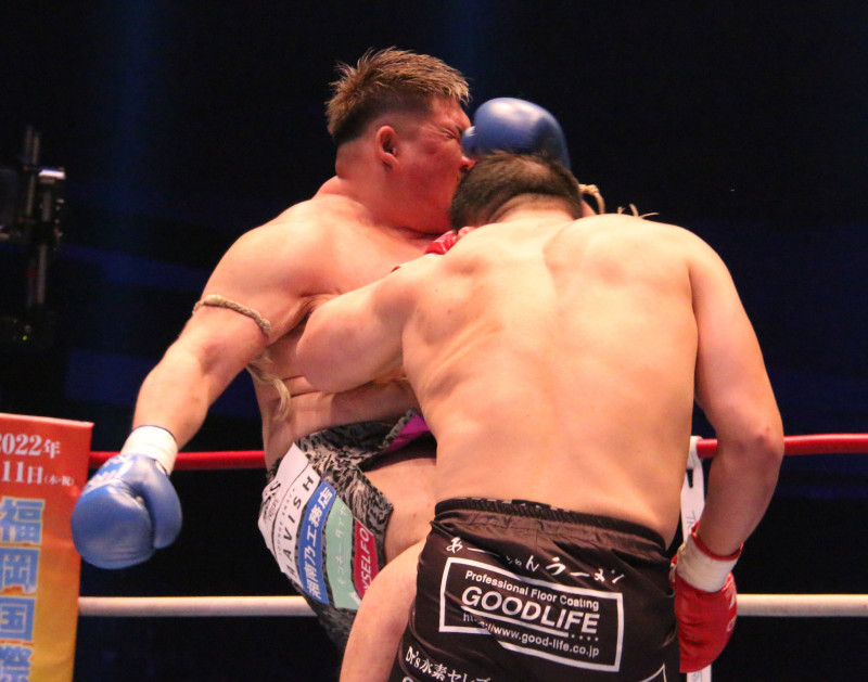左フックをヒットさせる石井だが、実方のヒザ蹴りが脇腹に
