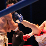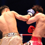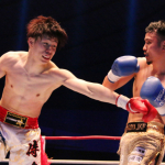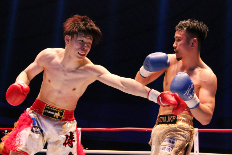 前K-1フェザー級王者の椿原(左)が、Krush同級王者の新美(右)に勝利
