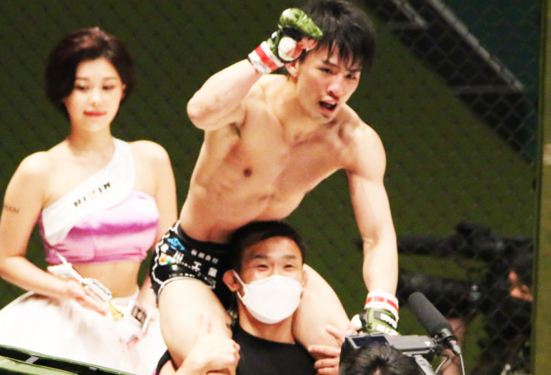 チームメイトの扇久保の肩車に乗り、勝利を喜ぶ征矢貴