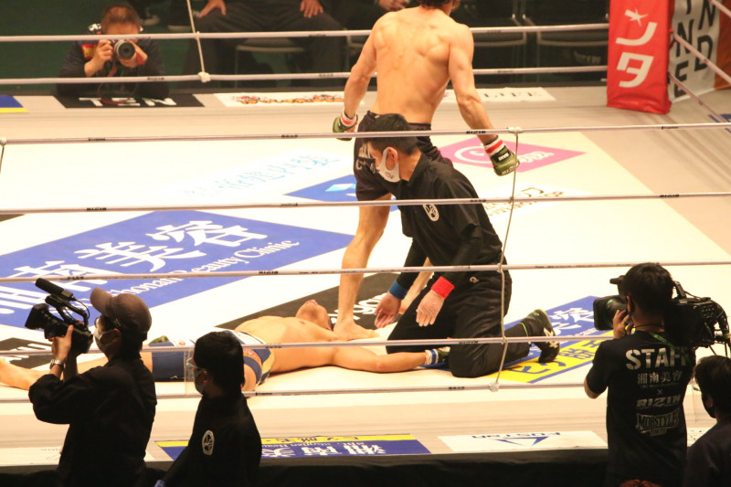 失神大の字の中島(左)、勝利の咆哮のケラモフ (右)