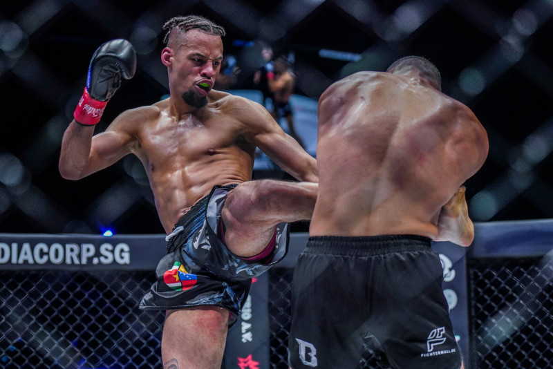強烈なミドルキックを蹴り込むアーセル