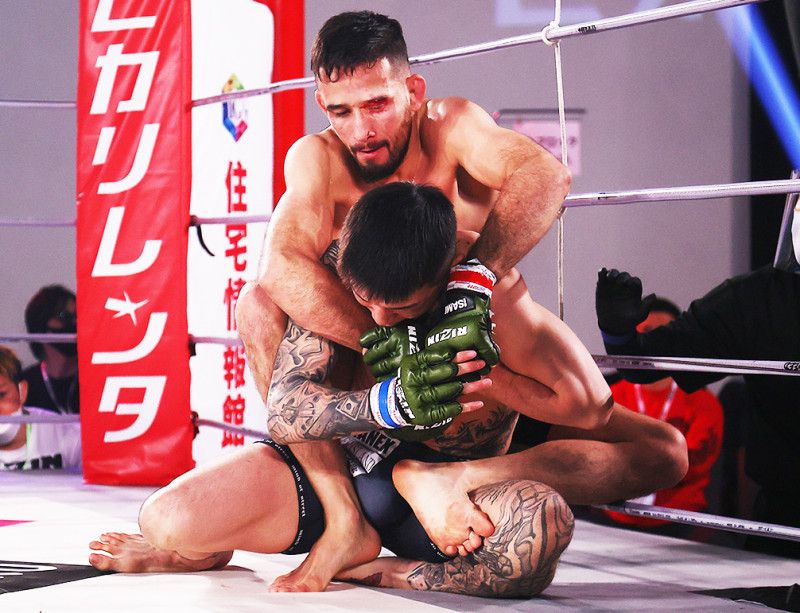萩原の打撃をもらい、左目カットで流血しながら極めに行くクレベル©️RIZIN