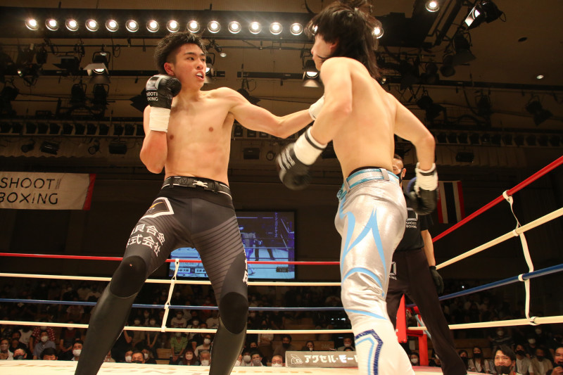 打ち合う2人。偶発的なバッティングで小林が出血し、TKO負けとなった