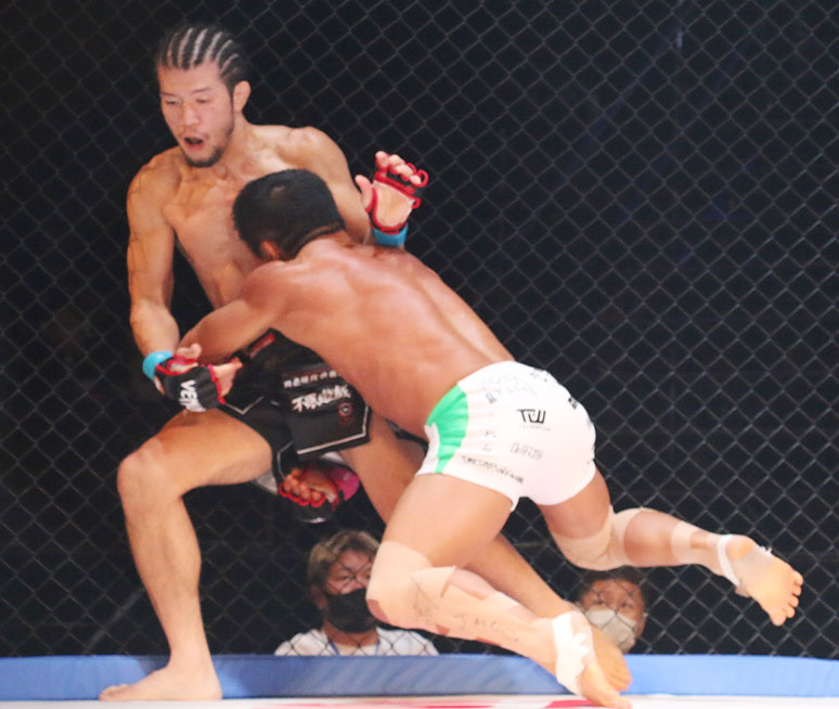 上迫をケージに押し込む北岡