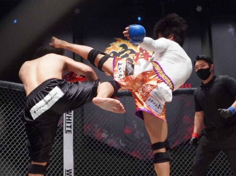 空手の上段蹴りを見せる咲人