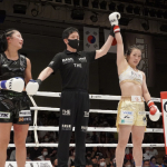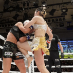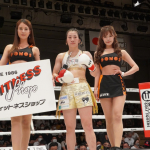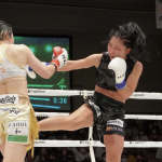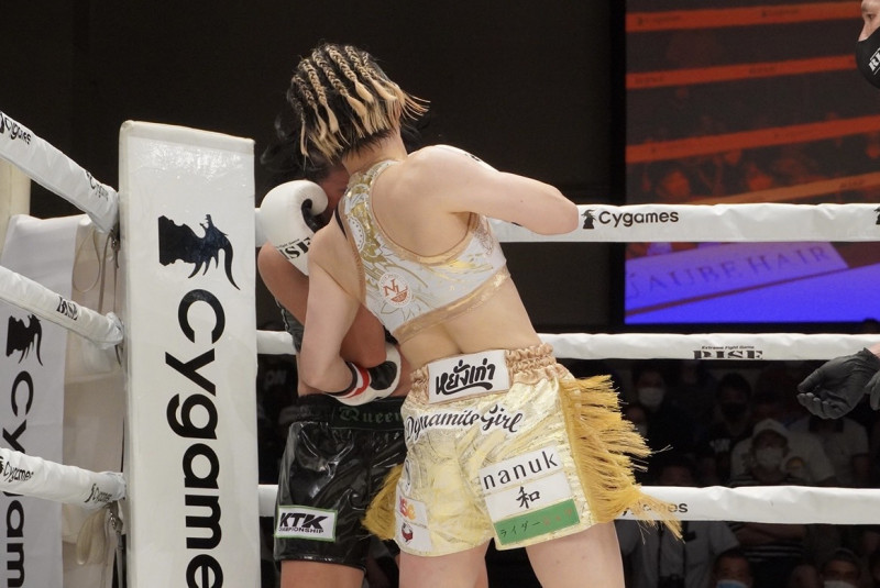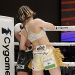 コーナーを背負ったドギョンにパンチを連打する小林