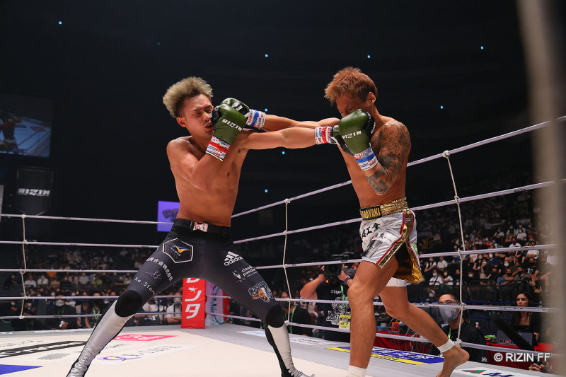 パンチを打ち合う笠原(左)と石月