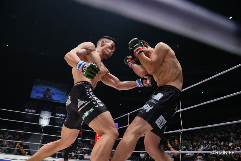 ボディにパンチを打ち込む中原