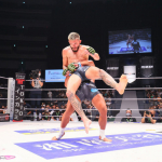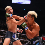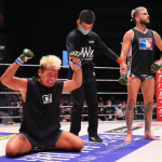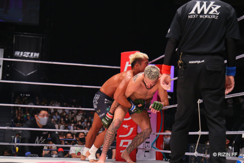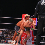 ジャーマンを仕掛ける武田、ケースはロープを触ってしまう