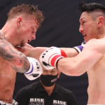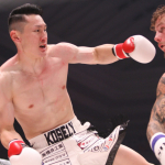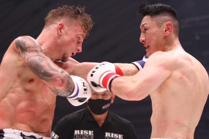 強烈なパンチを振るう山田(右)