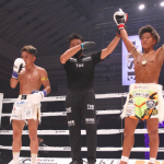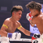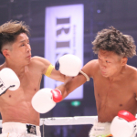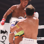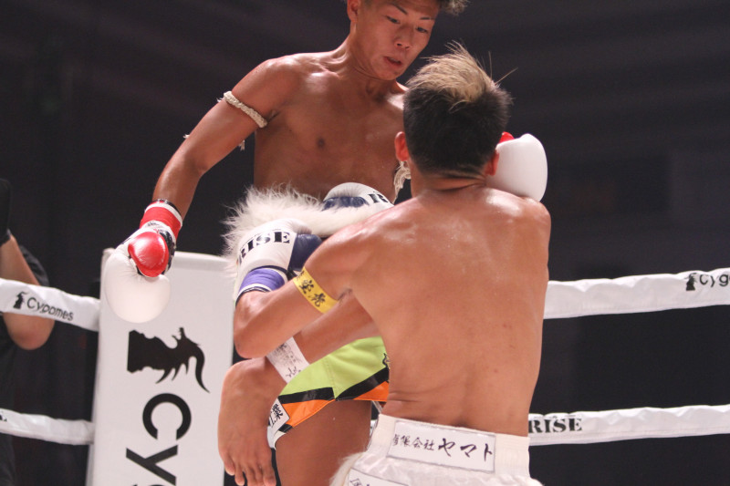 飛びヒザ蹴りを当てる塚本