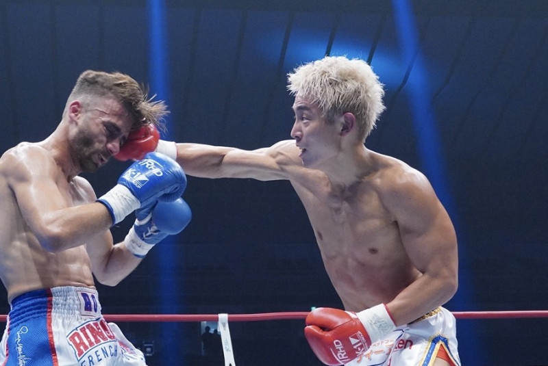 強烈なパンチを当てる大岩(右)