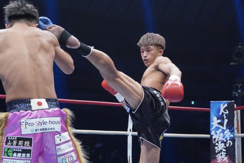 序盤からキックの連打を仕掛ける朝久