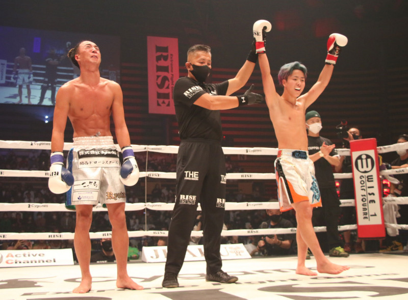 勝利を喜ぶ那須川(右)と悔しい表情の吉田(左)