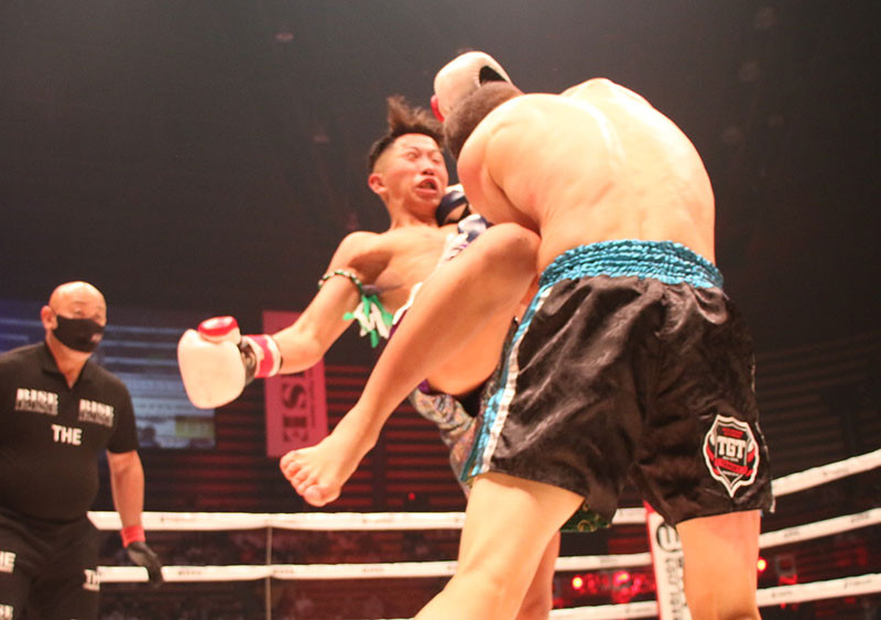 ヒザ蹴りで反撃する花岡