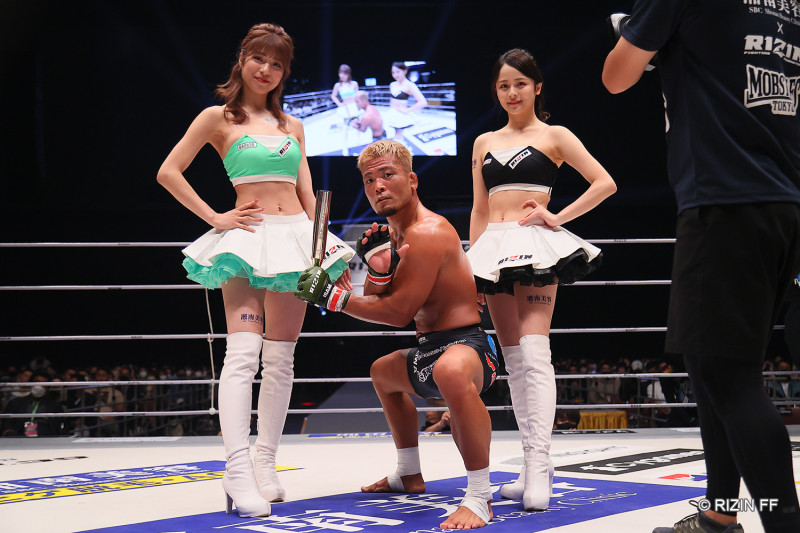 勝利し、ポーズを決める武田