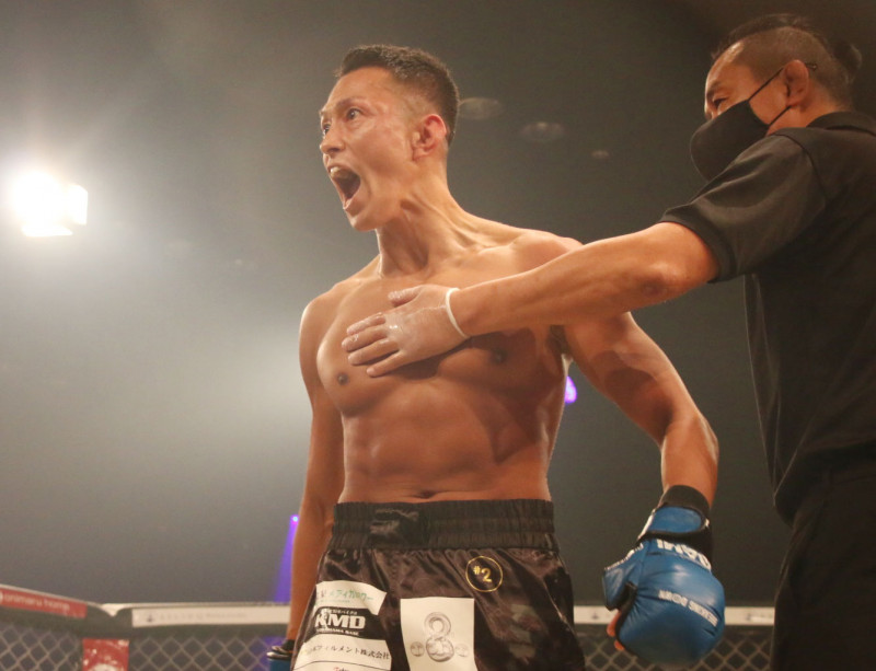 試合後、雄叫びを上げながらリングを歩く黒石