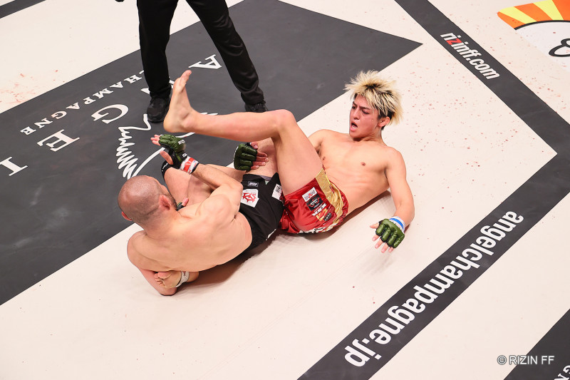 足関節を仕掛ける今成から逃げようとする鈴木