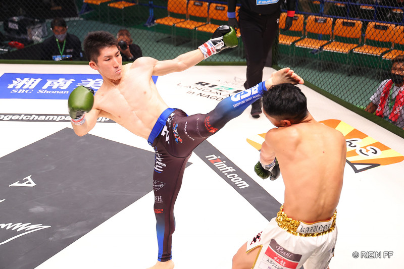 左ハイキックを決める佐藤