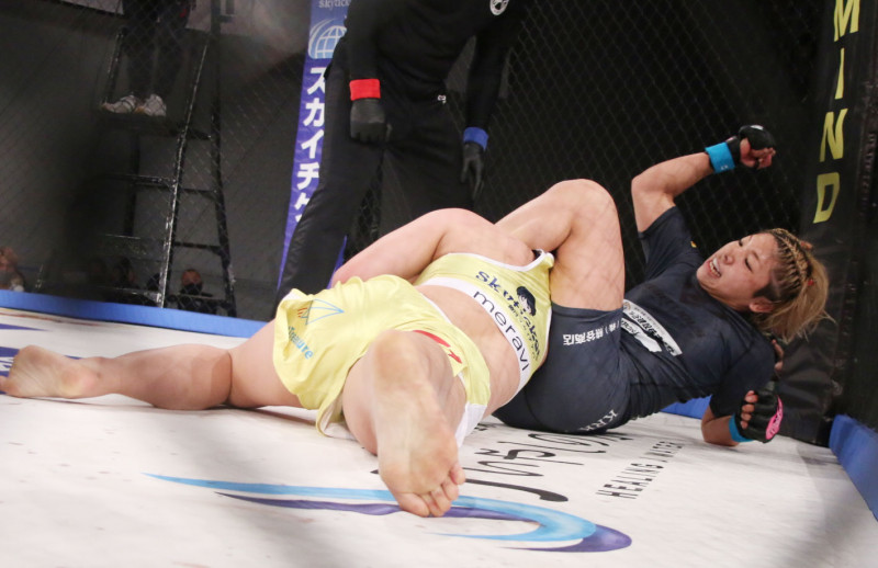 ARAMI(左)は極めきれず、万智がパウンド連打で印象づけた