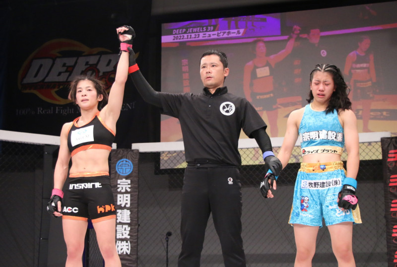 勝ち名乗りを受ける本野