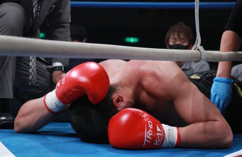 マットにうつ伏せ、後頭部を押さえるカリミアン