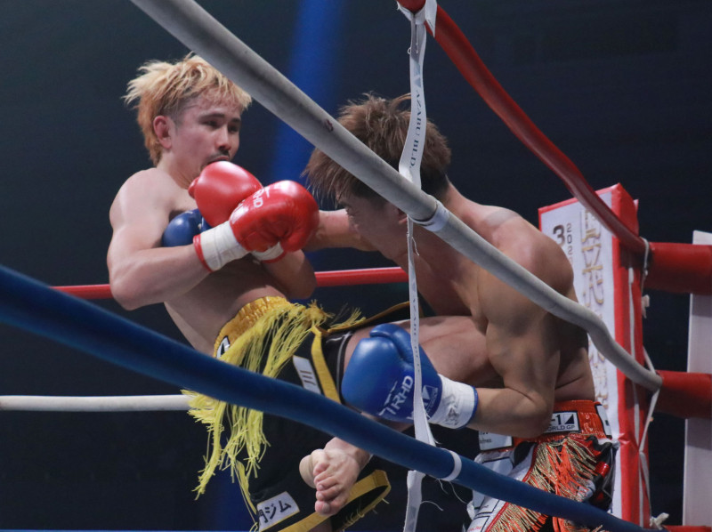 國枝がパンチで反撃もヒザ蹴りで攻める新美